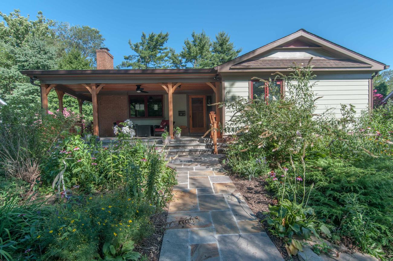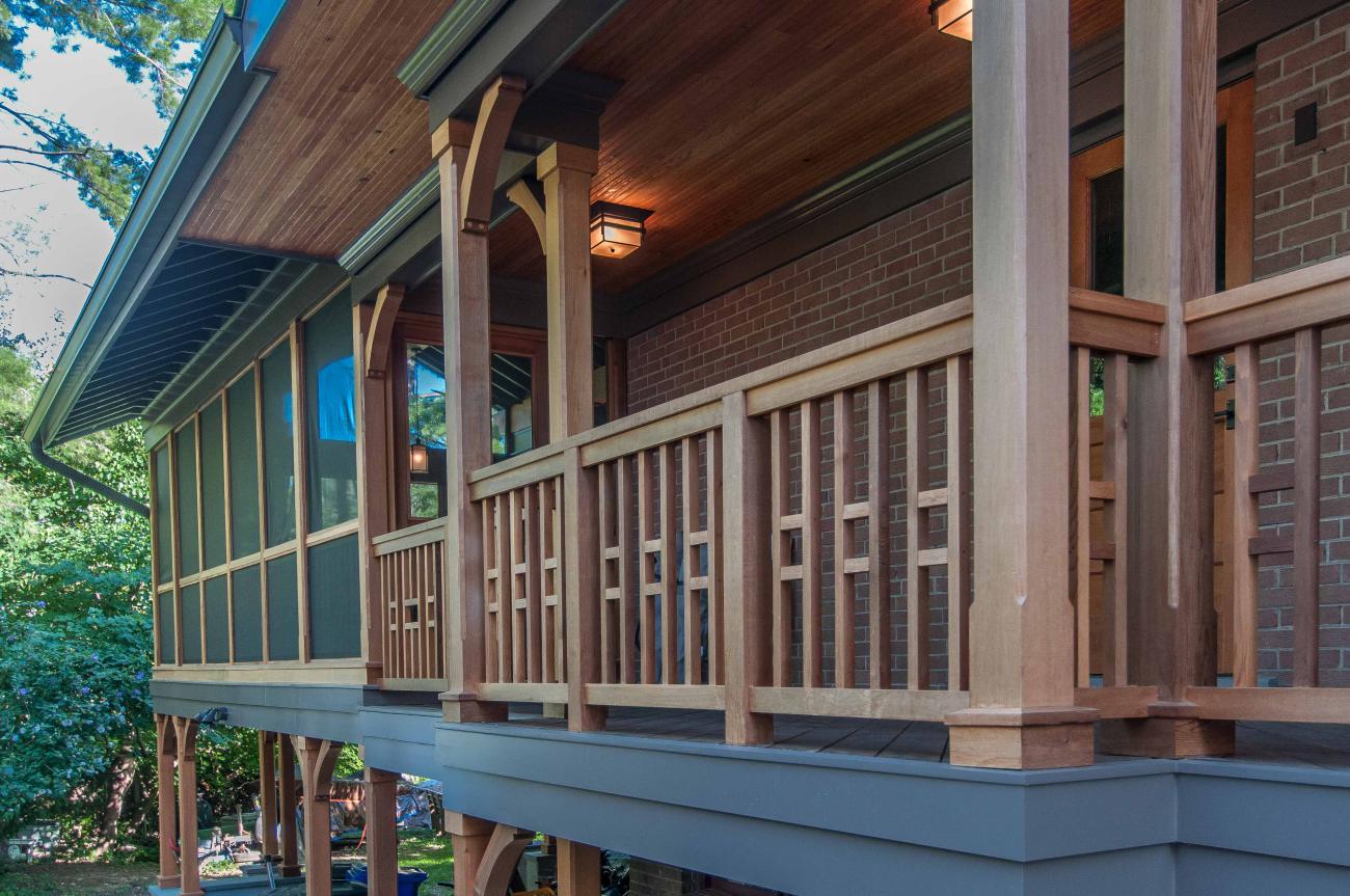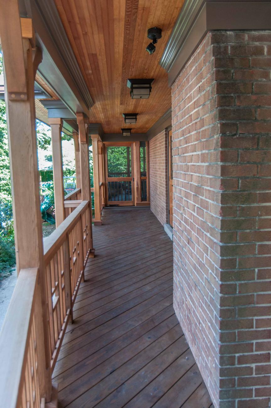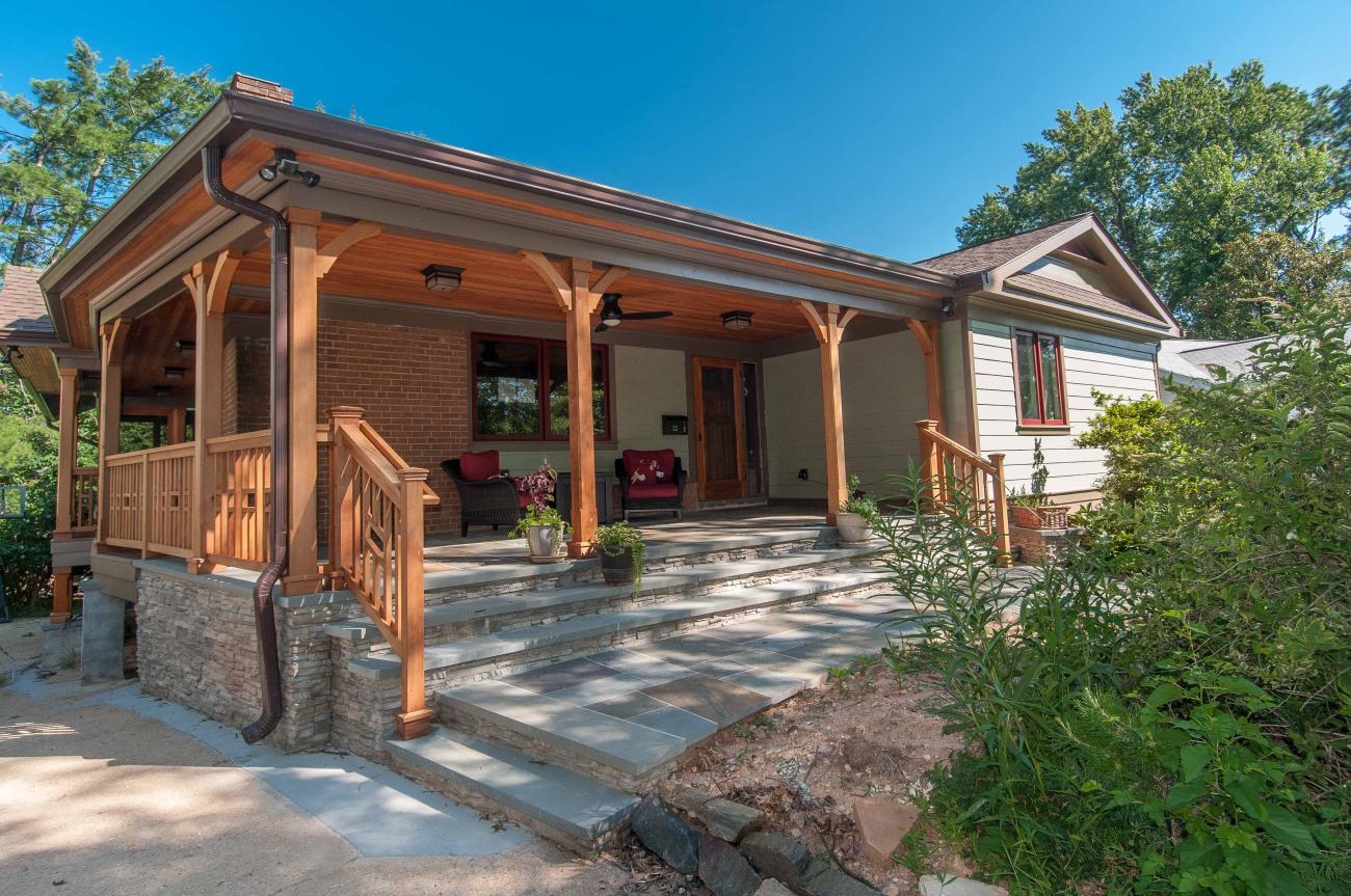 We designed a front porch with a wrap-around connection to a large screened porch, a large open deck, and stairs down to a large patio and fire pit area. We relocated the existing solar panels.