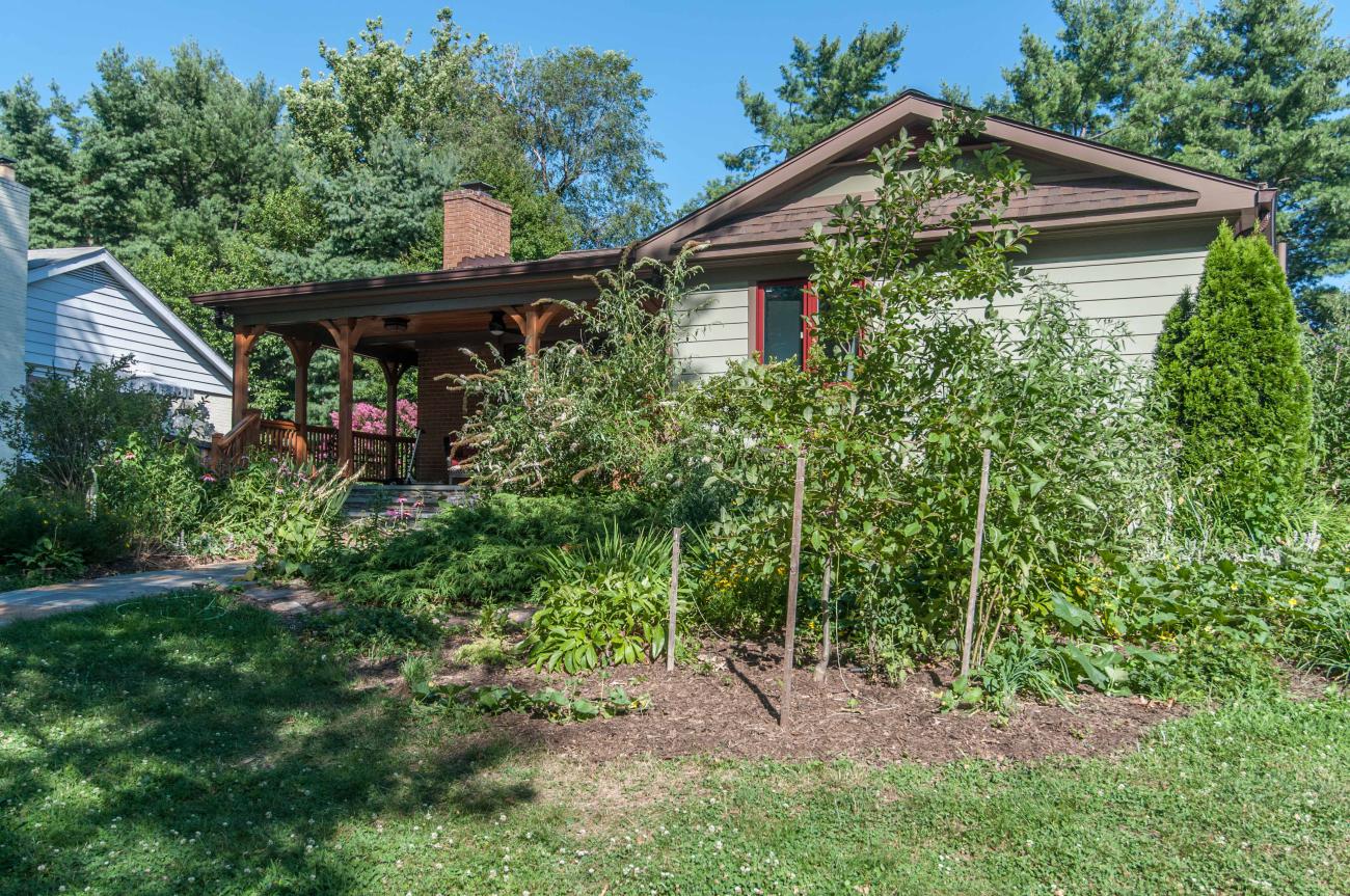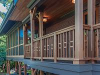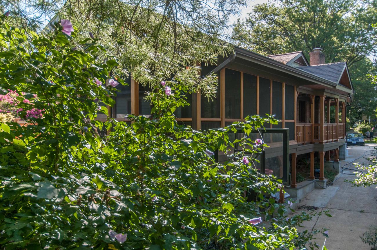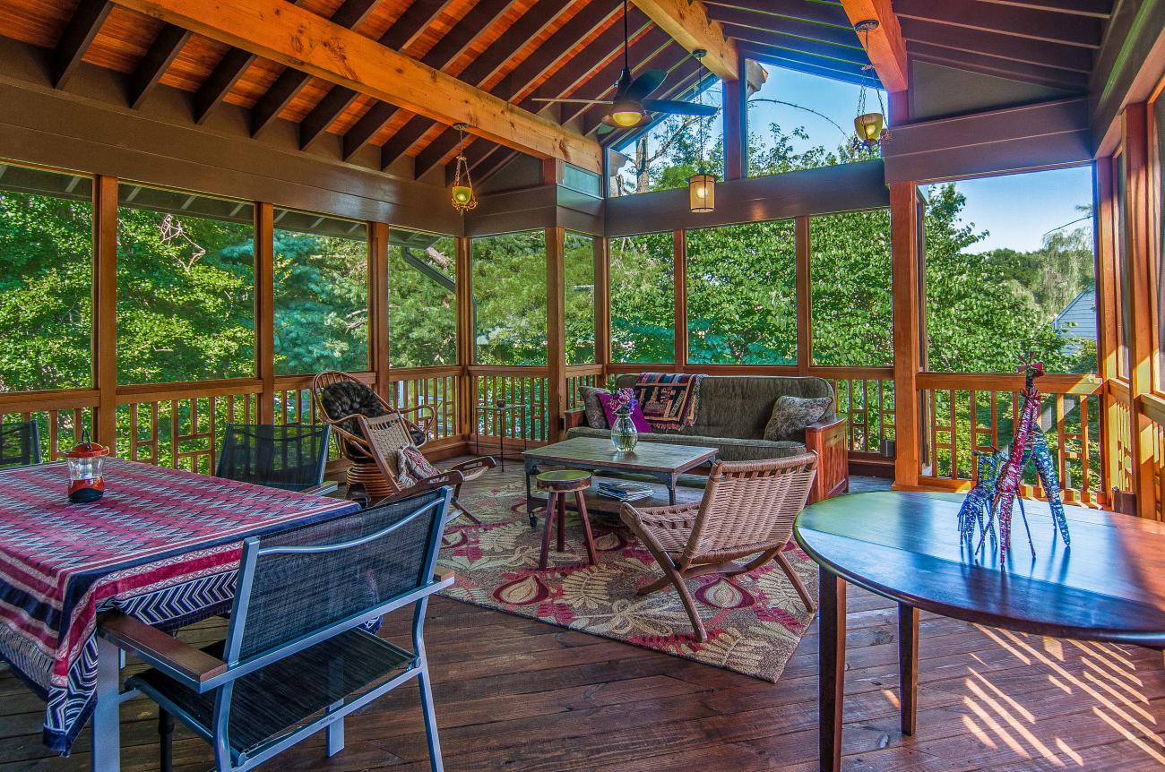 We designed a front porch with a wrap-around connection to a large screened porch, a large open deck, and stairs down to a large patio and fire pit area. We relocated the existing solar panels.