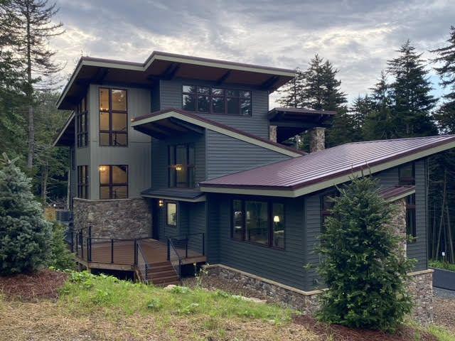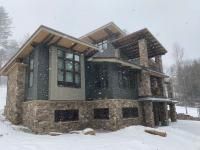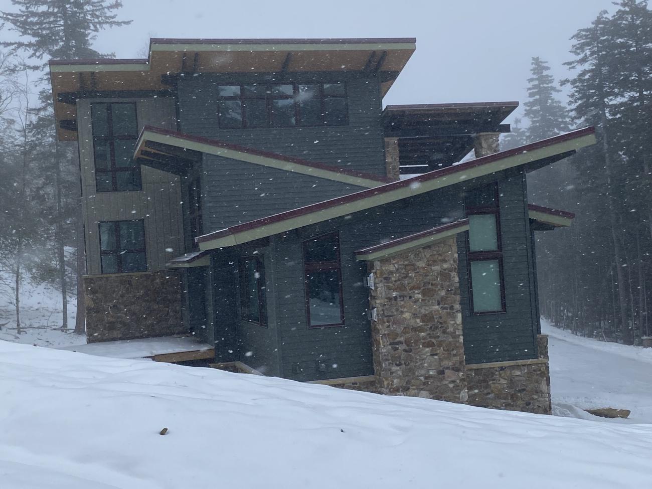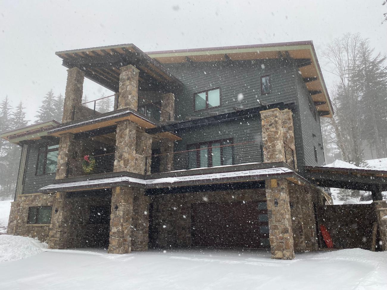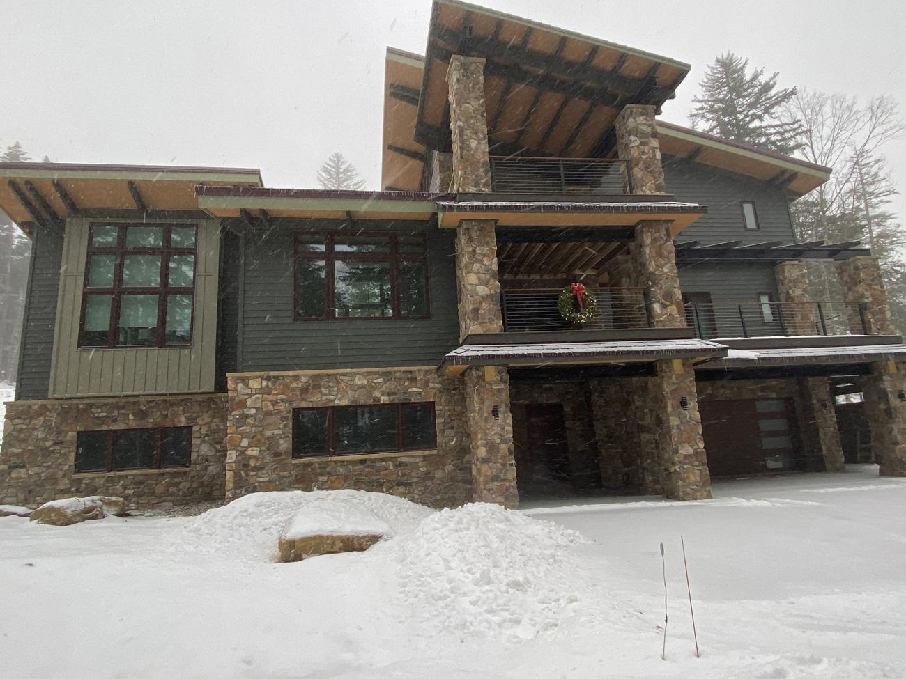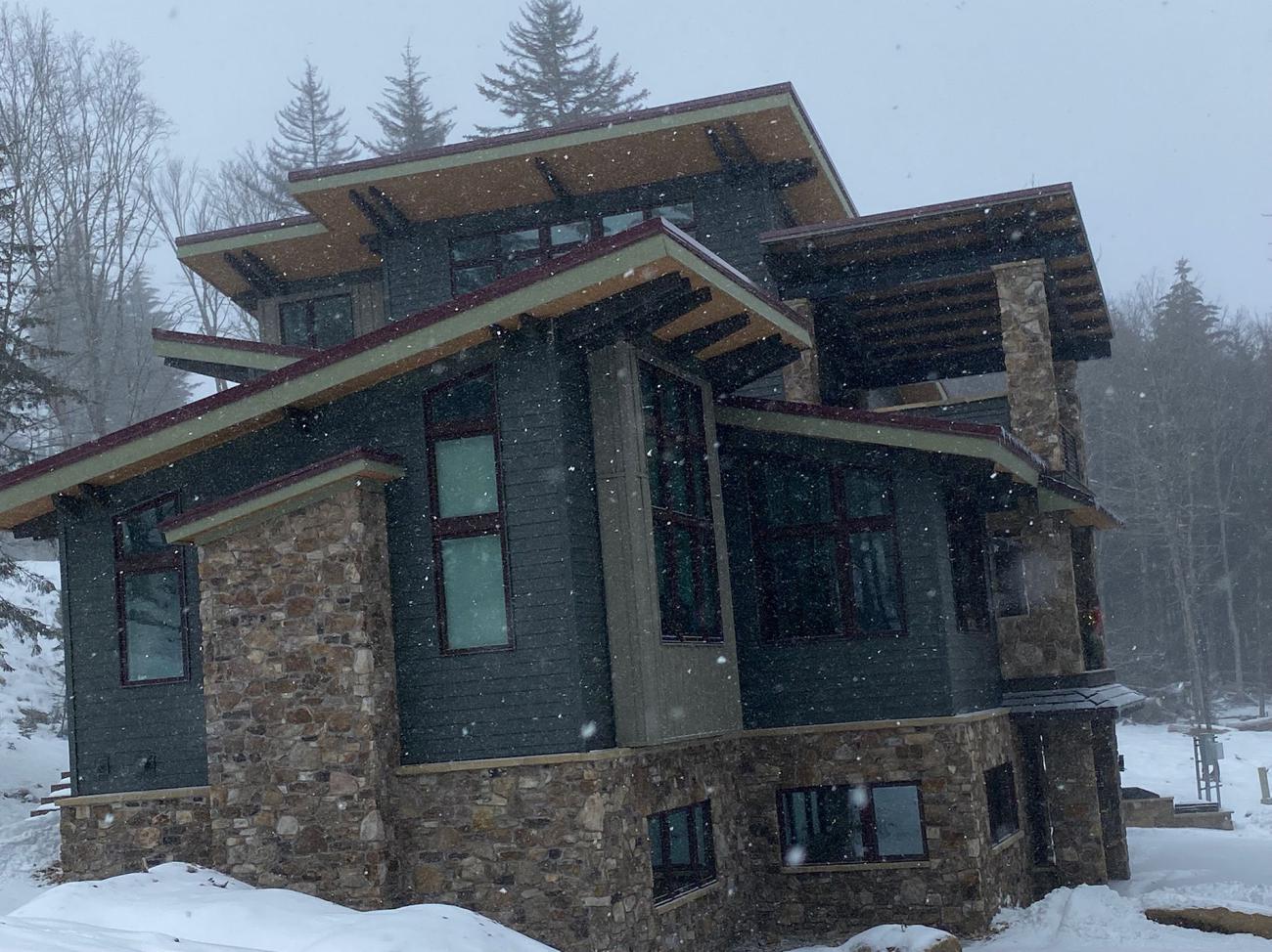 - 5-foot roof overhangs, local stone veneer, and durable custom steel siding designed for harsh winter climates