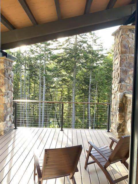 - A three-level front porch and porch tower framing panoramic slope views