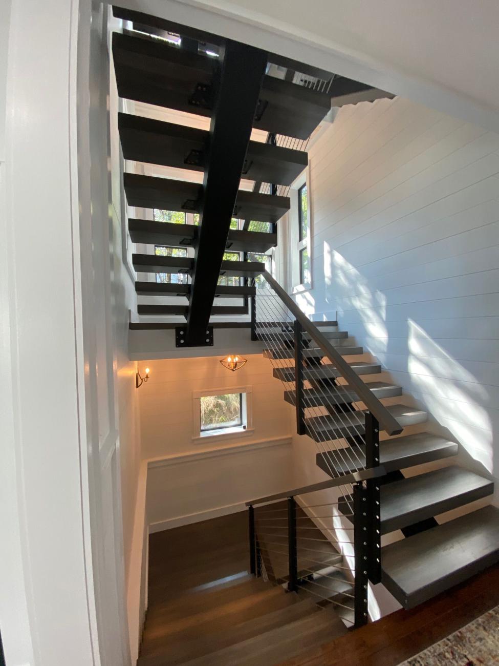 - A glass and steel stair tower with dramatic mountain-facing views