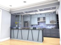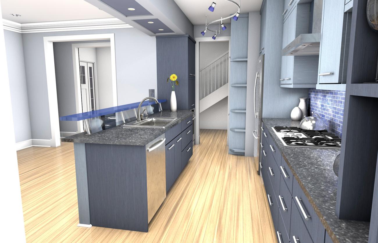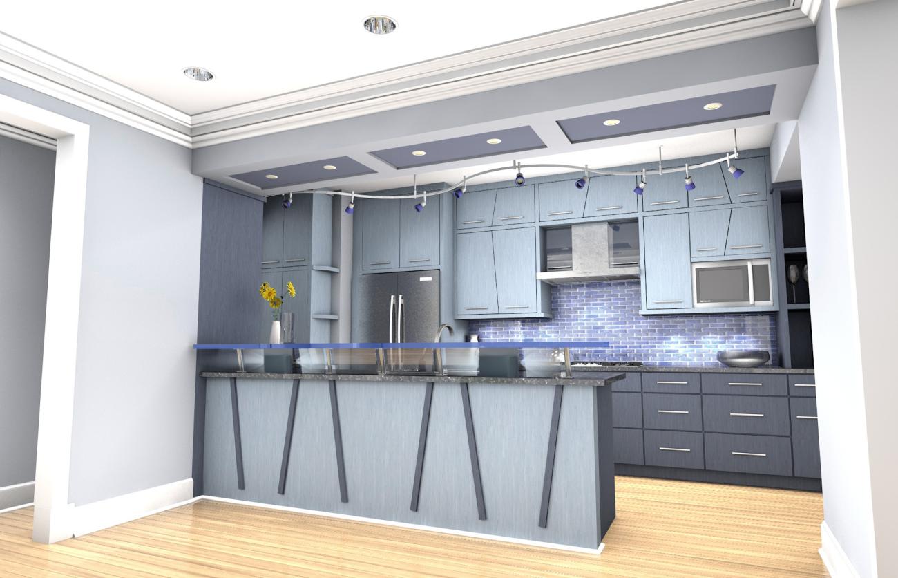 - Two-tone slate blue cabinetry