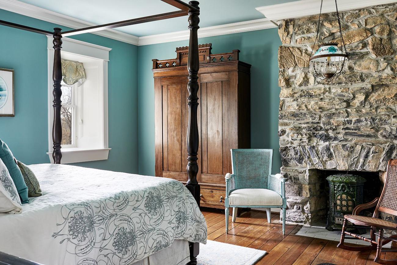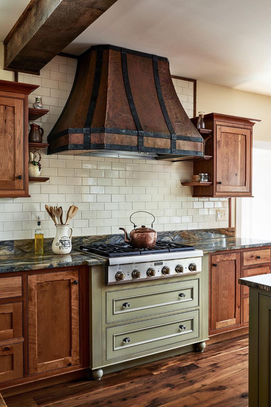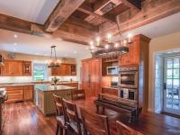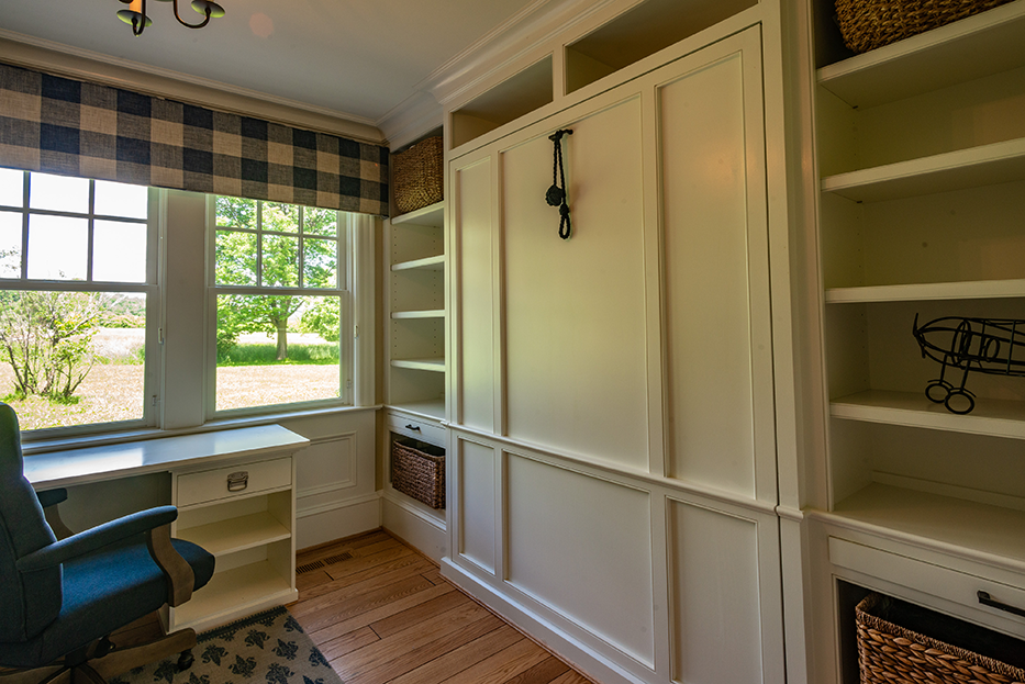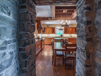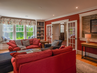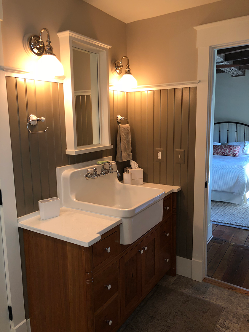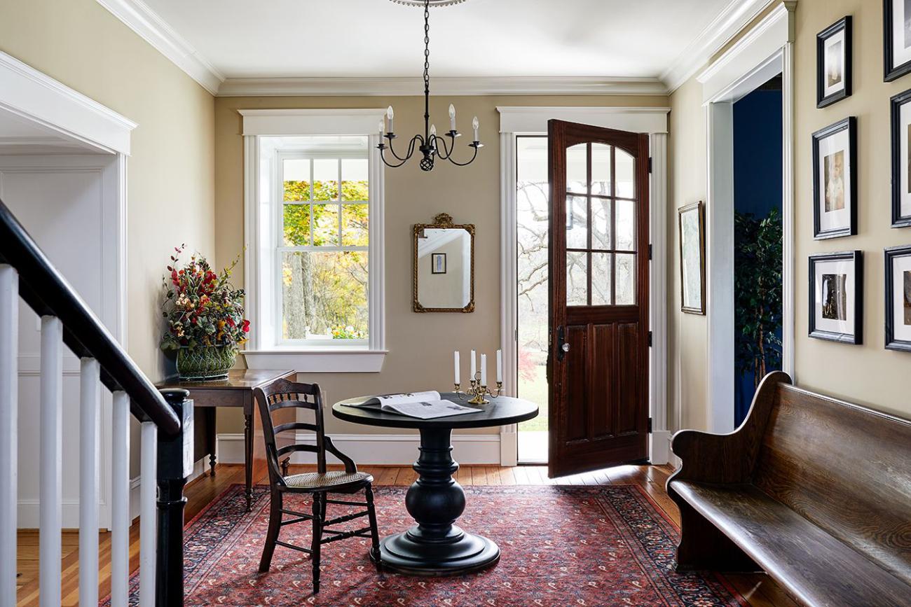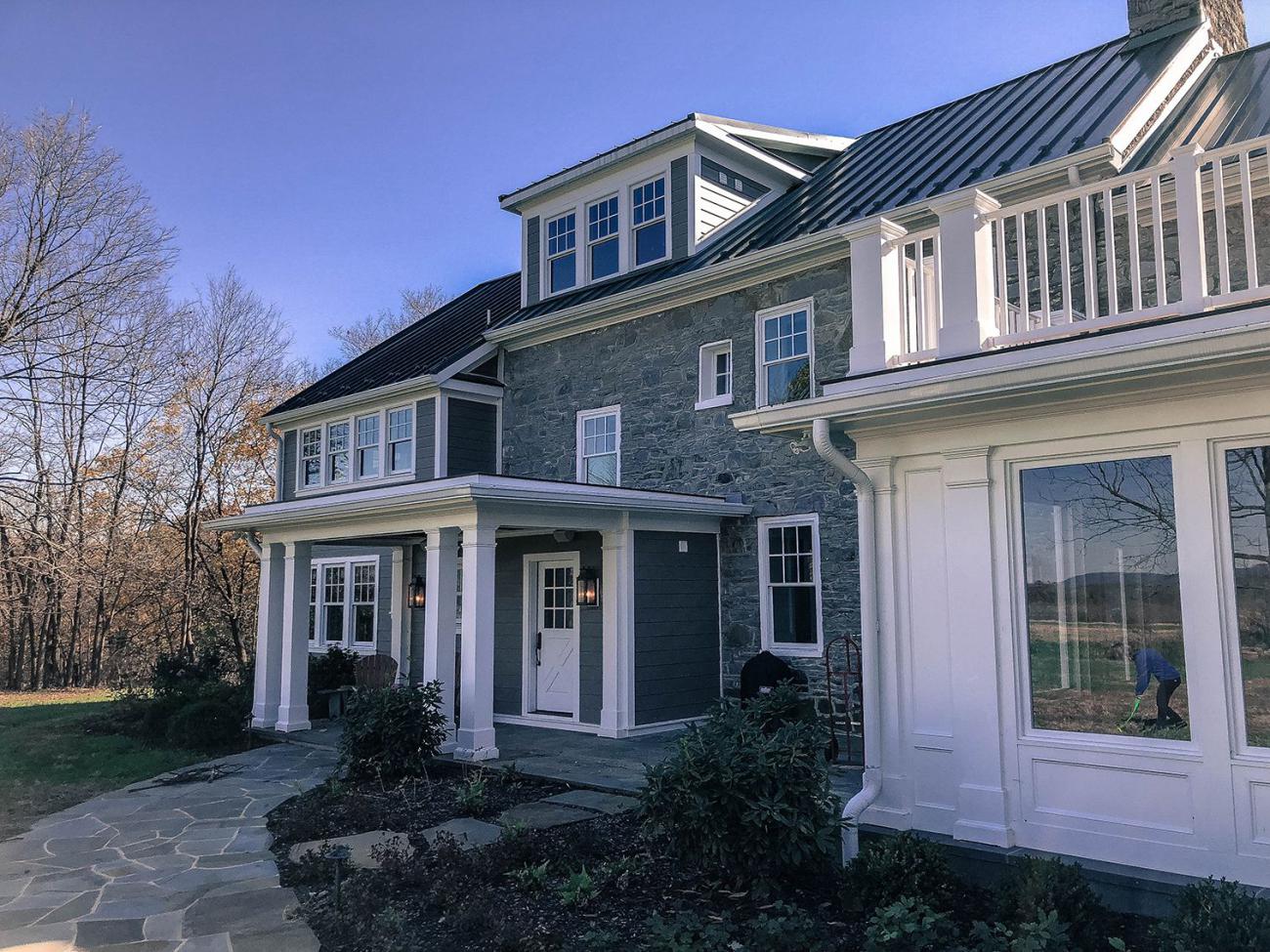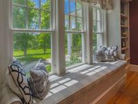 The renovation carefully blended historic preservation with modern comforts: reclaimed flooring, vintage light fixtures, and hand-selected finishes pair with new kitchens, bathrooms, HVAC systems, smart wiring, and insulation. A newly added dormer opens to panoramic river views. The side wing was transformed into a custom farmhouse kitchen featuring character cherry cabinetry, walnut accents, vintage tile, and a bespoke copper hood.