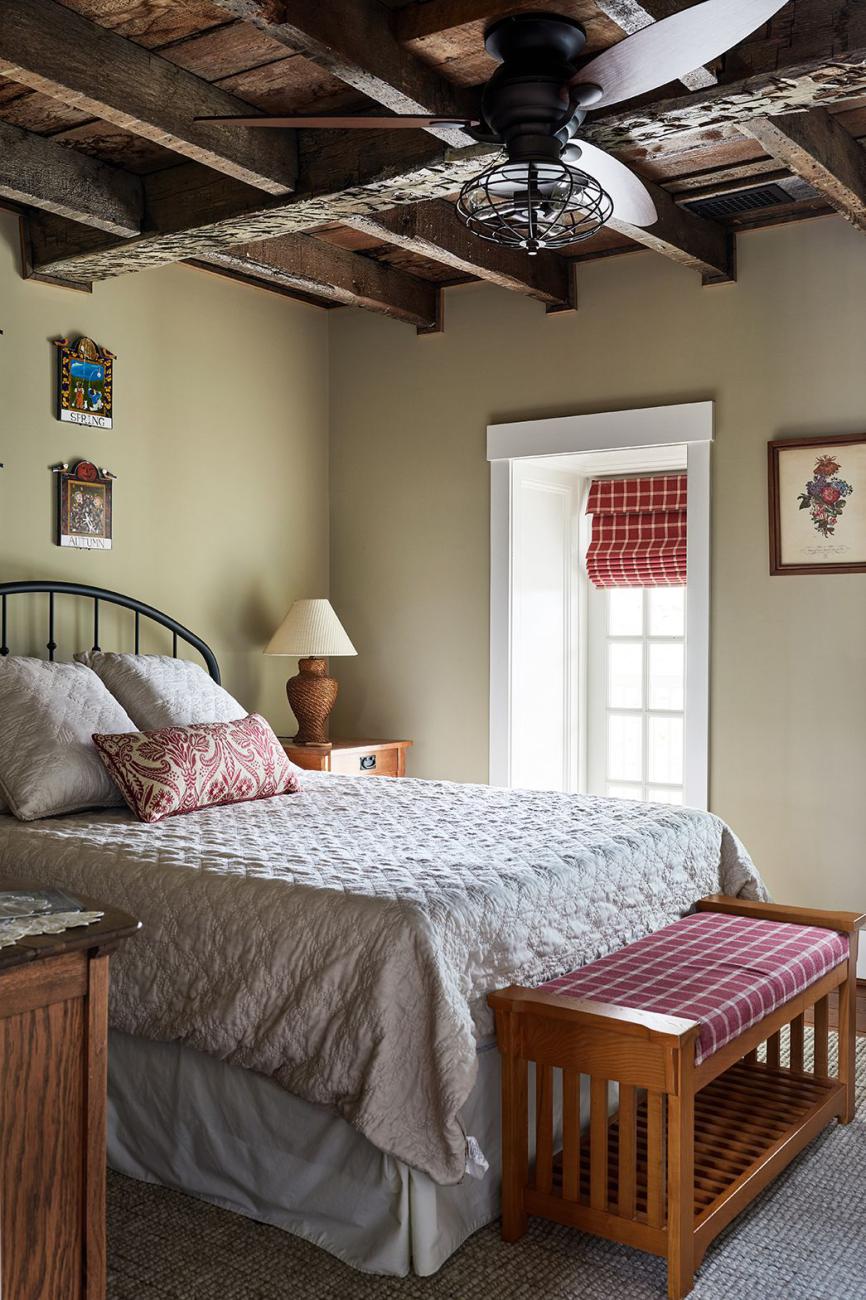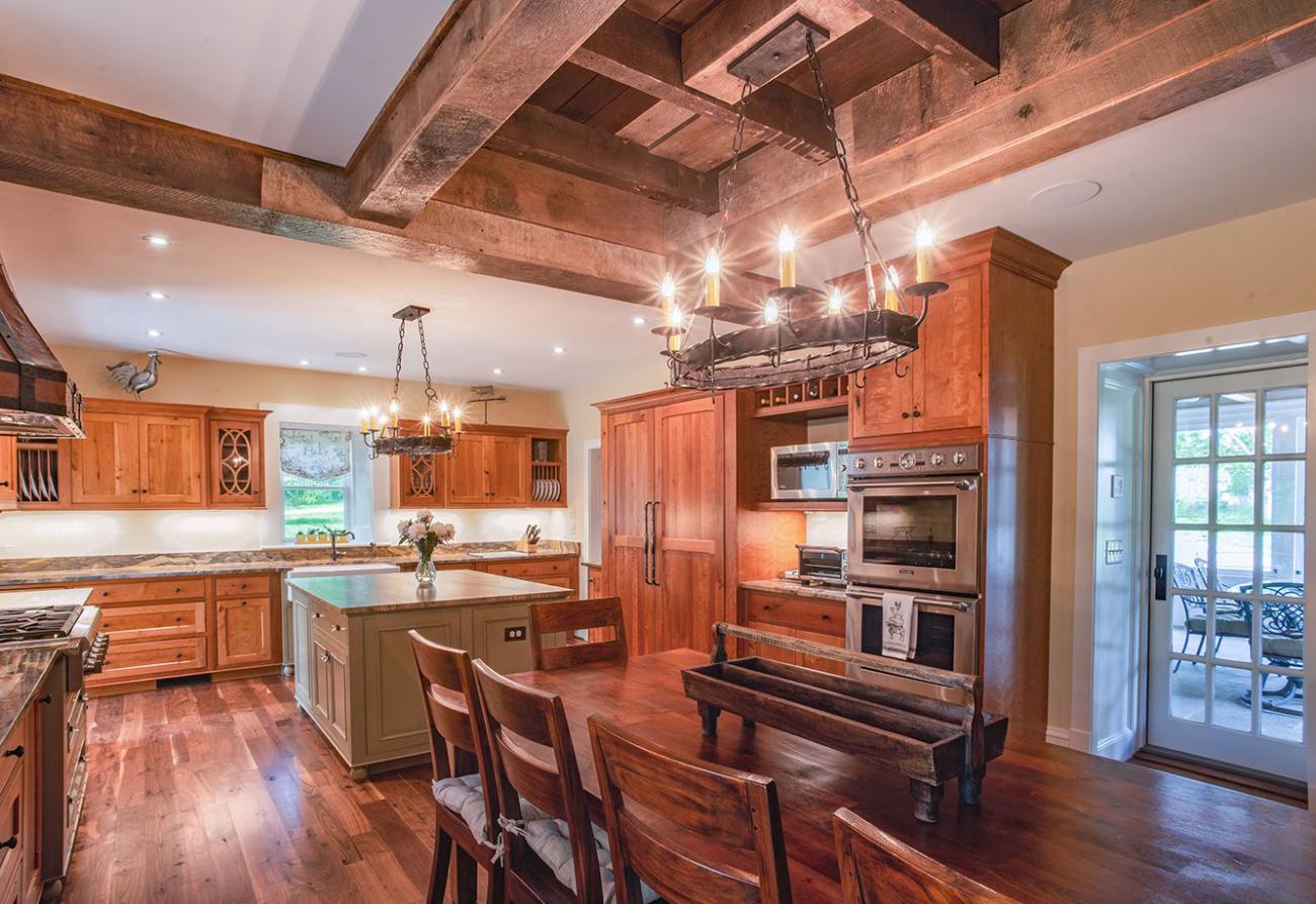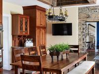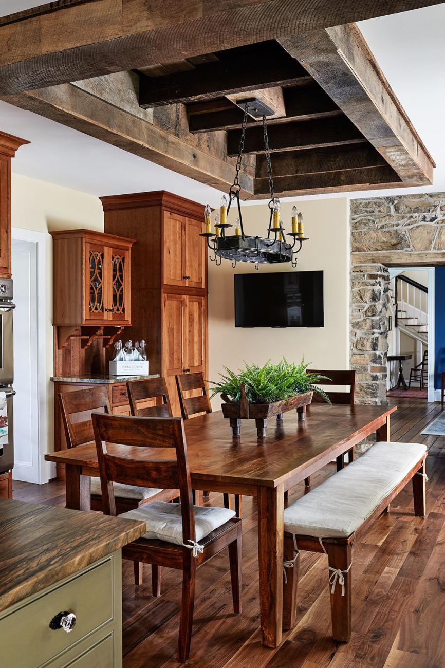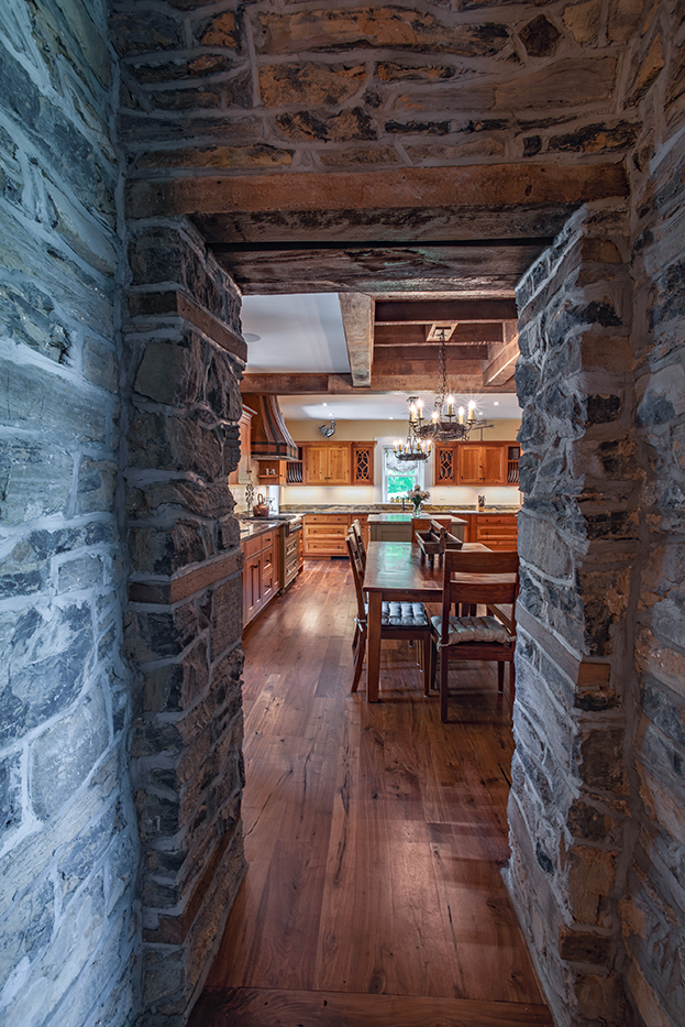 With its two-foot-thick stone walls and well-maintained metal roof, the farmhouse offered a solid yet weathered foundation. The team began by removing the damaged plaster, uncovering a stunning original timber frame that became central to the new design. In the Family Room, the restored wood beams remain exposed, preserving the home’s authentic character.