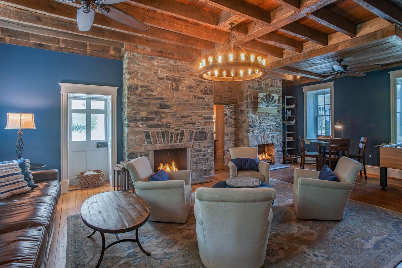 Adjacent structures were also reimagined. The old Well House was converted into a bourbon room complete with a new porch and side patio—perfect for entertaining. Future phases include plans for a new barn and pool to further activate the riverside retreat.