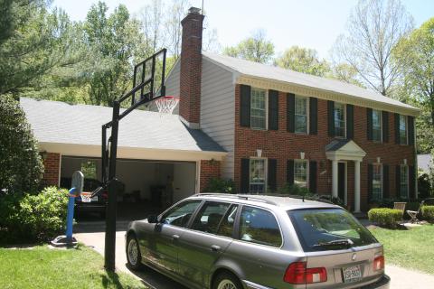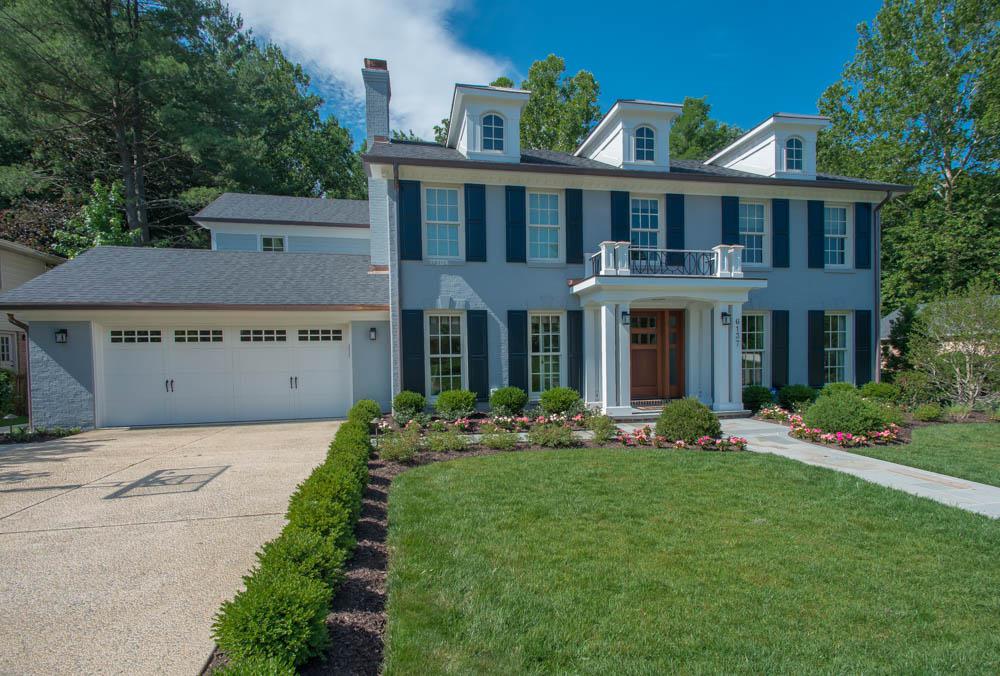 We first re-did the front facade with landscaping, new shutters, new windows, a new portico, new roofing, new dormers, and a new garage door.