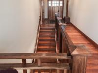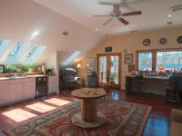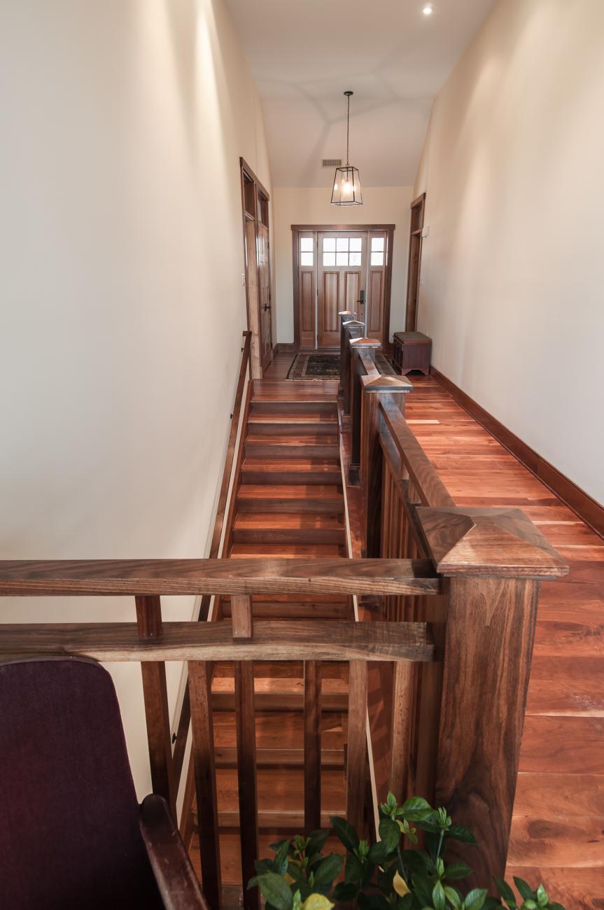 The stair leads down into the kitchen, dining and living room. A rear family room connects to a 4th bedroom with an en suite bath, an exercise room, and a side mudroom with a dog washing station. The side door off of the kitchen also connects to a hot tub deck and grilling area.