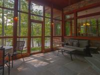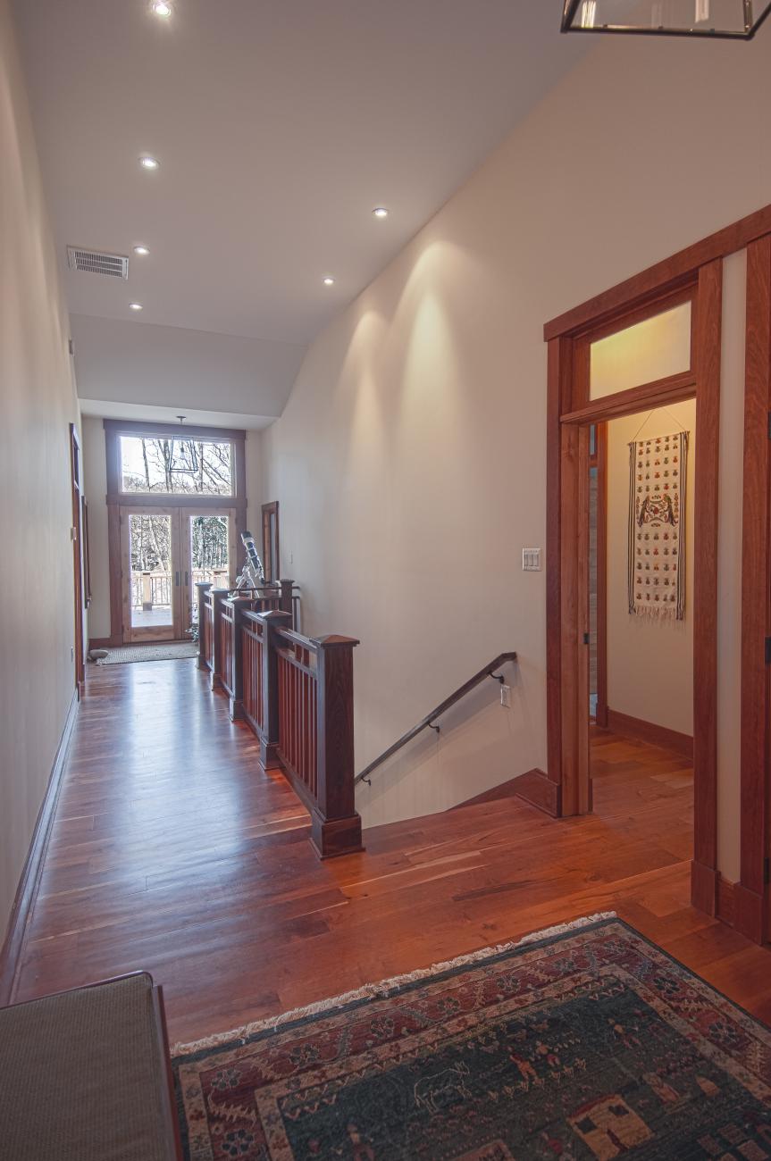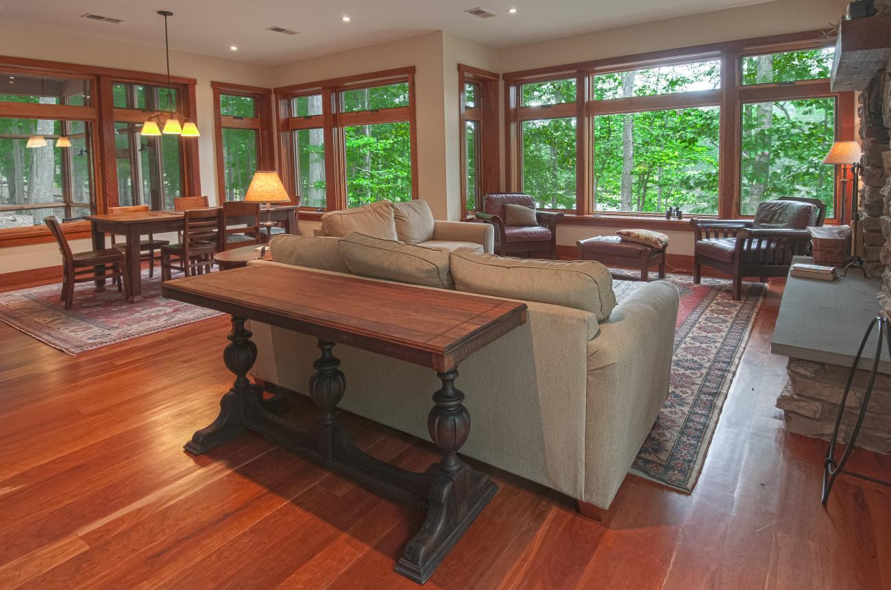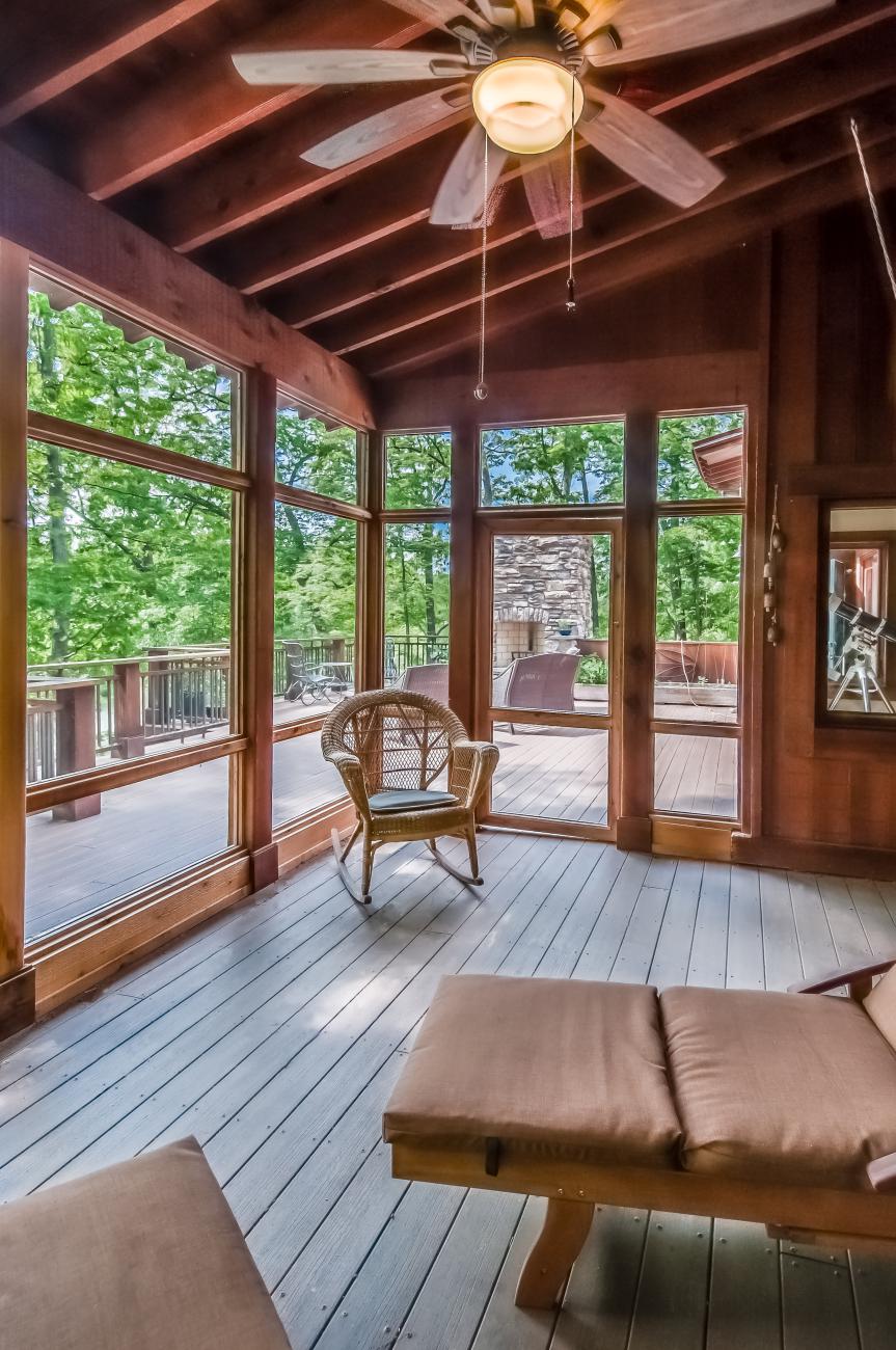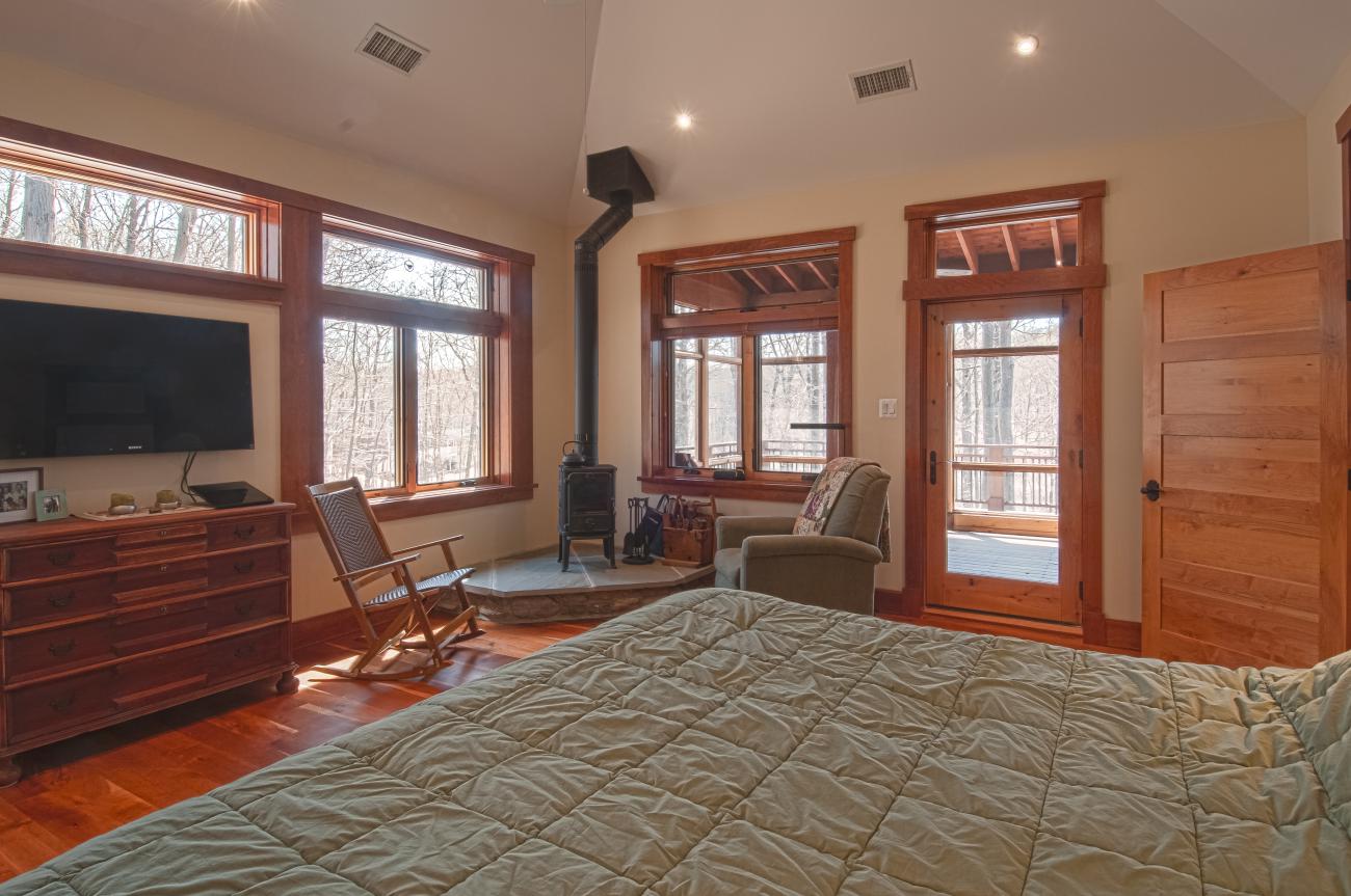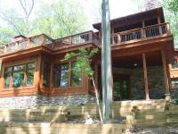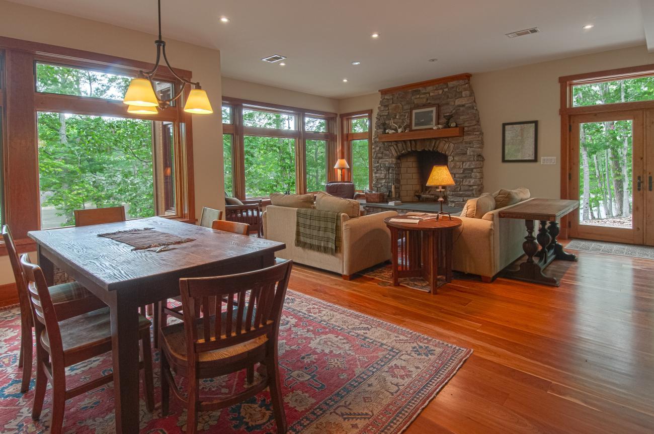 We tucked the home in a location to minimize the trees that had to be taken down. The home has insulated concrete walls, geothermal heating, character cherry floors, alder doors, wood stoves to help with heating, eldorado stone walls mixed with cedar siding, and offers two levels of screened porches for enjoying the lake views.